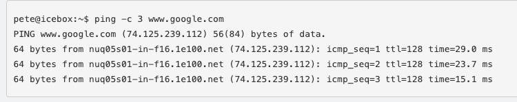 이 예에서는 ping을 사용하여 www.google.com에 연결할 수 있는지 확인합니다. -c 플래그(count)는 카운트에 도달한 후 에코 요청 패킷 전송을 중지하는 데 사용됩니다. 첫 번째 부분은 64바이트 패킷을 74.125.239.112(google.com)로 보내고 나머지 부분은 여행의 세부 정보를 보여줍니다. 기본적으로 초당 패킷을 보냅니다.