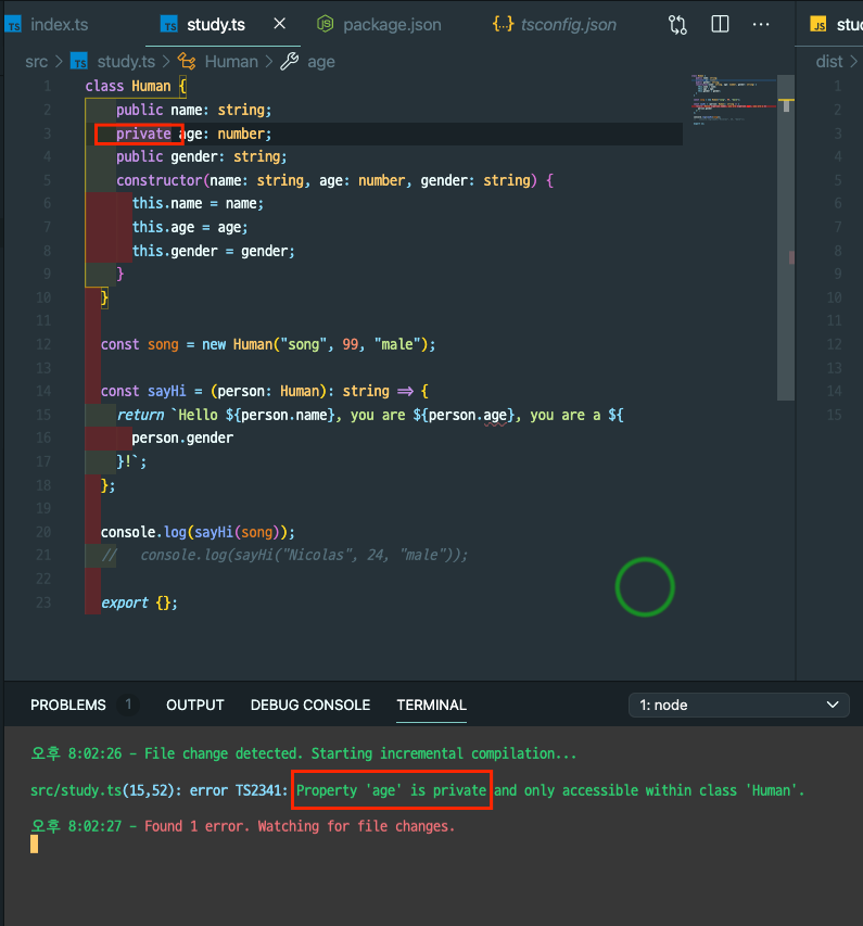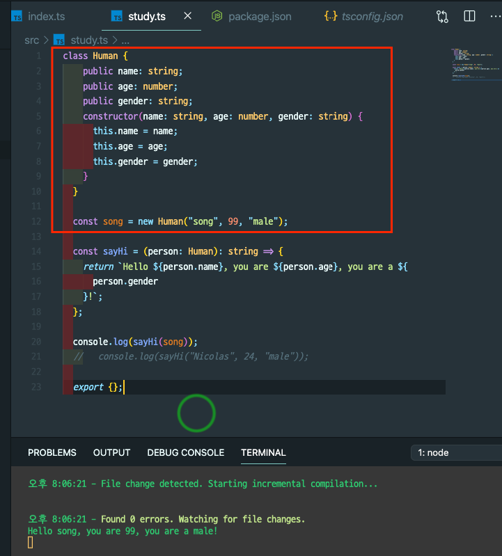 셋팅 순서 npm init -y "scripts": { "test": "echo \"Error: no test specified\" && exit 1", "start":"node index.js", "prestart":"tsc" }, tocuh tsconfig.json { "compilerOptions": { "module":"CommonJS",..