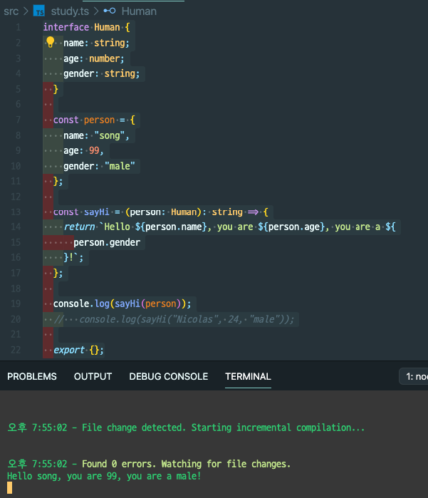interface에서 형식을 주고, person 객체를 만들어 인자값을 줘도 함수가 작동( js에서는 안되고 ts만 가능한 것)