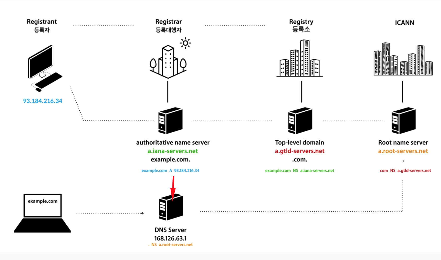 DNS 서버는 루트네임 서버에게 아이피를 물어보고, 각 계층 내려가면서 아이피 주소를 사용자에게 알려준다