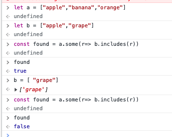 대상 배열 ["apple","banana","orange"]이 있고 다른 배열에 대상 배열 요소 중 하나가 포함되어 있는지 확인하고 싶습니다. 예를 들면 다음과 같습니다. ["apple","grape"] //returns true; ["apple","banana","pineapple"]